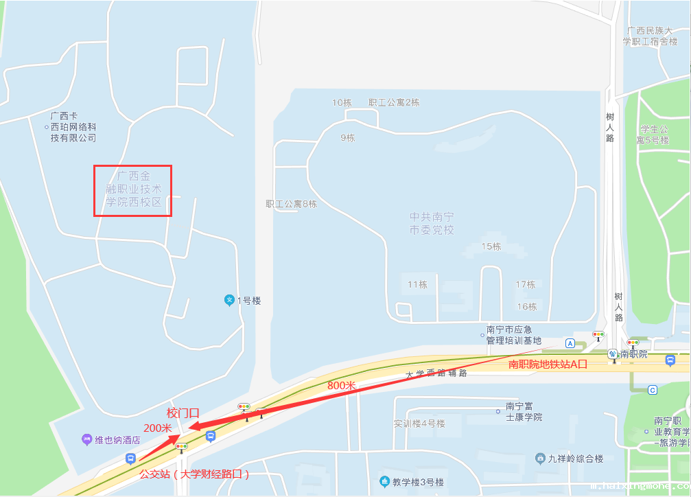 学校位于南宁市西乡塘区大学西路168号,可乘坐公交车103路、807路大学财经路口下,或乘坐地铁1号线到“南职院”站A口出站(如图所示)。